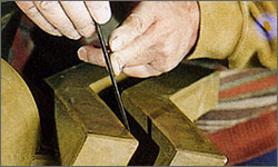 ![]() 【2】型紙を使って粘土板に図面を罫書き、カマで切り付け表面を作る。 |